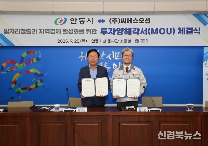 [신경북뉴스] 안동시와 ㈜씨에스오션은 9월 25일 안동시청 소통실에서, 160억 원 규모의 유리섬유 철근 대체재(GF-Bar) 공장 신설을 위한 투자 양해각서(MOU)를 체결했다.