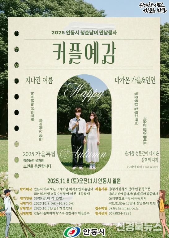 [신경북뉴스] 안동시가 청춘남녀의 건강한 만남을 지원하기 위해 마련한 ‘2025 커플예감! 힐링피크닉’ 시즌4 참가 신청을 10월 30일까지 접수한다.