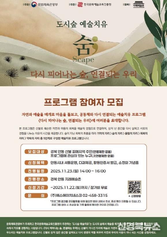 한국문화예술교육진흥원 관계자는 “이번 프로그램은 산불 피해로 상처 입은 숲을 다시 일으켜 세우기 위한 마음을 모으는 자리”라며, “자연과 예술이 함께하는 특별한 경험을 통해 시민들이 회복과 위로의 시간을 갖게 되길 바란다”고 말했다.