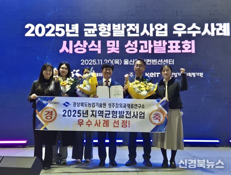 [신경북뉴스] 경상북도는 20일 대통령 직속 지방시대위원회가 주관한 ‘2025년 지역균형발전사업 우수사례 시상식’에서 경상북도농업기술원 성주과채류연구소가 지역농업연구기반 및 전략작목육성(R·D) 지원계정 부문 우수사례로 선정돼 우수 기관상을 받았다.