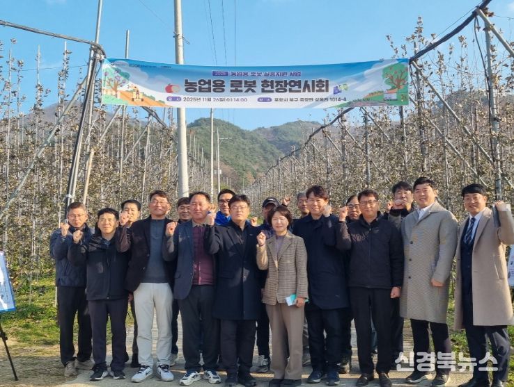 [신경북뉴스] 포항시는 26일 죽장면 상옥리 사과원에서 농촌진흥청, 한국농업기술진흥원, 경상북도, 지역 농업인 등 관계자 70여 명이 참석한 가운데 방제·운반·모니터링 로봇을 활용한 과수(사과)분야 현장 연시회를 개최했다.
