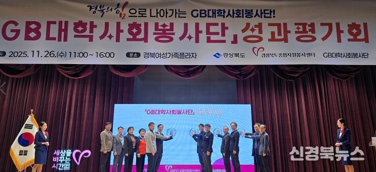 [신경북뉴스] 경상북도는 26일 경북여성가족플라자에서 ‘2025 GB(경북)대학사회봉사단 성과평가회’를 개최하고, 2025년 한 해 동안의 지역사회 곳곳에서 자원봉사로 활약한 GB대학사회봉사단의 성과를 공유하는 시간을 가졌다.