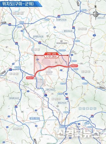 구미와 군위를 연결하는 구미-군위 고속도로는 대구 북부 중앙고속도로와 경북 서부 경부고속도로를 동서로 연결하는 국가간선도로망이며, 왕복 4차선 연장 21.2km 규모로 총사업비 1조 5,627억 원을 투입해 2029년 착공을 목표로 국가 재정 사업으로 본격 추진 된다.