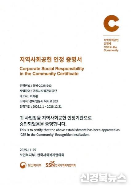 [신경북뉴스] 안동시시설관리공단이 2025년 지역사회공헌인정제에서 A+ 등급을 획득하며 2년 연속 인증기관으로 선정됐다. 올해 지역사회와의 협력체계를 확대하고 공헌활동의 실질적 효과를 강화한 점이 높게 평가되면서, 지역사회를 위한 노력이 한층 더 인정받는 결과로 이어졌다.