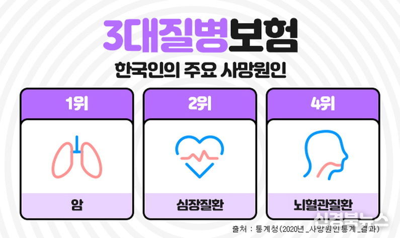 [신경북뉴스] 한국인의 주요 사망원인중에 암, 뇌혈관질환, 심혈관질환은 흔히 3대질병이라 일컬어지며 살아가면서 가장 먼저 대비해야 하는 중대질병으로 항상 강조되고 있다. 이들 질병에 미리 대비하기 위해 가입하는 것이 진단비보험인데, 이러한 3대질병진단비를 중점으로 보장하는 보장성보험이 3대진단비보험 이다. 3대질병진단비보험은 각각의 질병에 주목해서 보장하기도 하지만, 나에게 맞는 추가 특약을 잘 골라서 가입한다면 종합건강보험으로도 충분히 활용도가 높다.