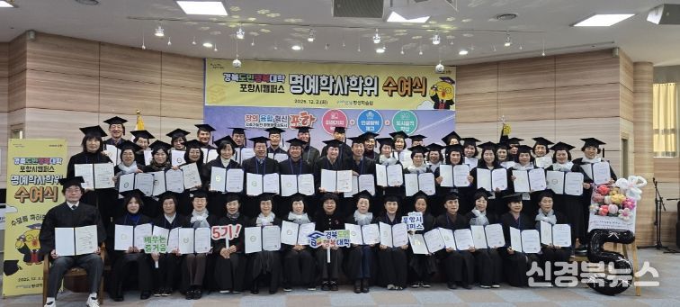 [신경북뉴스] 포항시는 지난 2일 뱃머리평생학습원에서 수료생 54명이 참석한 가운데 ‘2025년 경북도민행복대학 포항시캠퍼스 명예학사학위 수여식’을 열었다.
