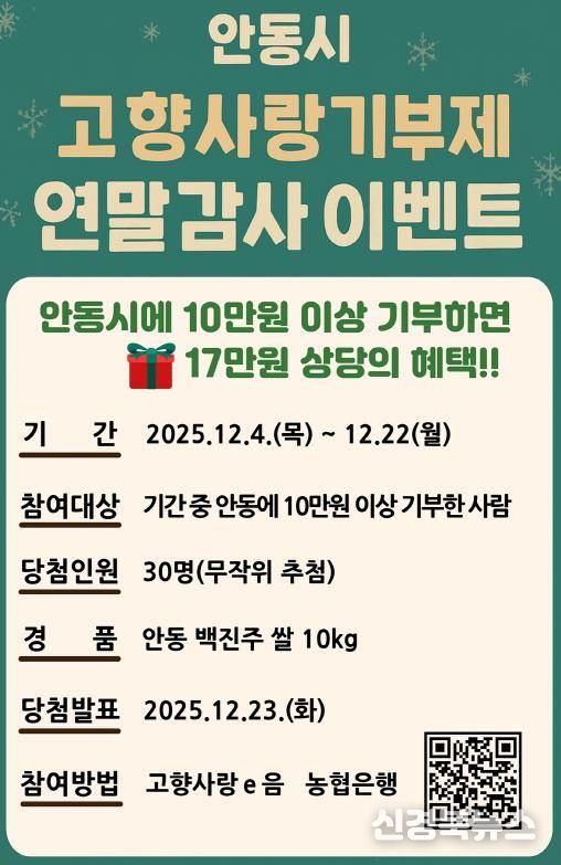 [신경북뉴스] 안동시는 연말정산 시즌을 맞아, 고향사랑기부제 참여자에게 감사의 뜻을 전하고 기부 문화를 확산하기 위해 12월 22일(월)까지 ‘안동시 고향사랑기부제 연말 감사 이벤트’를 진행한다고 밝혔다.