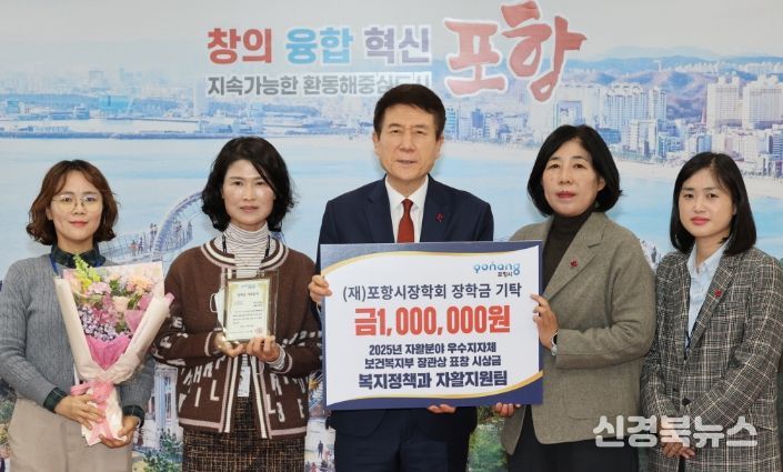 포항시는 2025년 자활사업 우수 지자체로 선정되어 보건복지부 장관 표창을 수상했으며, 이에 따른 포상금 100만원을 지역 인재 양성을 위해 포항시장학회에 장학금으로 기탁했다.
