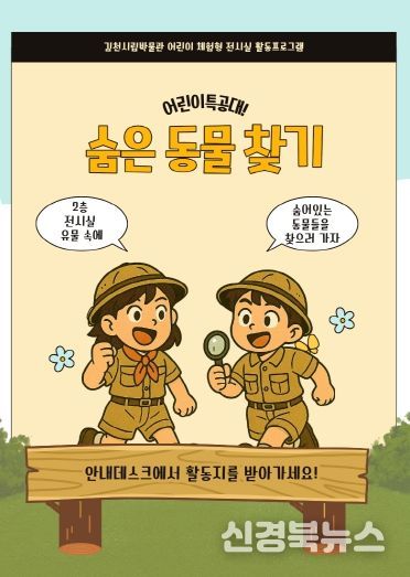 [신경북뉴스] 김천시시설관리공단(이사장 김재광)이 운영하는 김천시립박물관은 휴관이 종료되는 오는 12월 25일부터 상설전시실에서 어린이 관람객을 위한 체험형 전시 활동프로그램 '어린이특공대! 숨은 동물 찾기'를 운영한다.