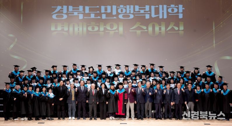 [신경북뉴스] 경상북도는 24일 도청 동락관에서 경북도민행복대학 21개 시군 캠퍼스(학사) 및 6개 대학캠퍼스(석·박사) 관계자 등 600여 명이 참석한 가운데, 학사 866명, 석사 142명, 박사 60명 등 총 1,068명에 대한 ‘경북도민행복대학 명예학위 수여식’을 개최했다.