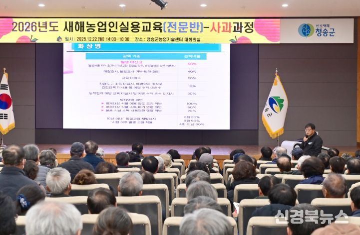 [신경북뉴스] 청송군은 지난 22일부터 24일까지 3일간 청송군농업기술센터 대회의실에서 실시한 ‘2026년도 새해농업인 실용교육(전문반)’을 성황리에 마무리했다고 밝혔다.