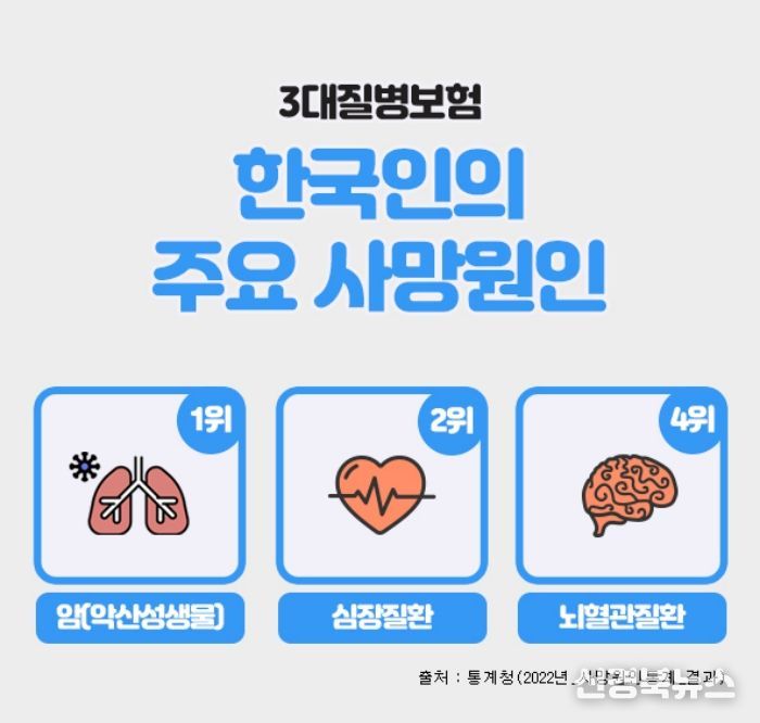 [신경북뉴스] 3대질병으로 일컬어지는 암, 뇌혈관질환, 심혈관질환은 한국인의 주요 사망원인에서 상위를 차지하고 있으며, 이에 대한 진단비를 집중적으로 보장해 주는 보험상품을 3대질병진단비 보험이라 할 수 있다.