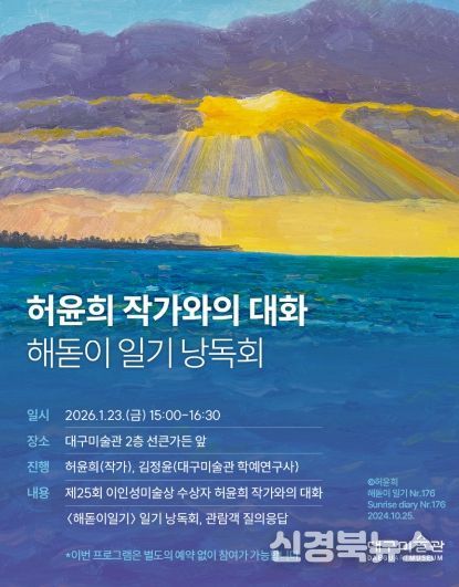 [신경북뉴스] 대구문화예술진흥원 대구미술관은 제25회 이인성미술상 수상자전 ‘허윤희: 가득찬 빔’의 전시 연계 프로그램으로 ‘허윤희 작가와의 대화: 해돋이 일기 낭독회’를 1월 23일 오후 3시, 대구미술관 2층 선큰가든에서 개최한다.