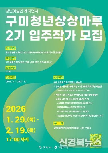 [신경북뉴스] (재)구미문화재단(대표이사 이한석)은 청년 예술인의 창작 역량 강화와 지역 문화예술 활성화를 위해 청년예술인 레지던시 공간인 구미청년상상마루 2기 입주작가를 모집한다.