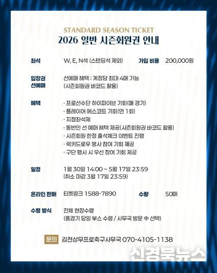 김천상무프로축구단(대표이사 이재하)이 1월 30일 14시부터 시즌회원, 어린이 시즌회원, 티켓북 판매를 시작했다.
