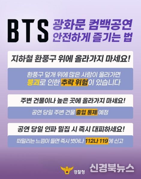 [신경북뉴스] 경찰청은 BTS의 광화문 컴백공연과 관련해 관람객들에게 안전수칙을 안내했다.