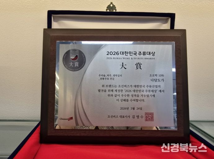 [신경북뉴스] 상주시 외남면에 위치한 다담도가가 지난 3월 24일 조선비즈가 주최한 ‘2026 대한민국 주류대상’에서 우리술 탁주 생막걸리 전통주류 부문 대상을 받았다.