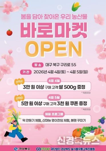 [신경북뉴스] 경상북도는 오는 4월 4일부터 12월 6일까지 매주 토․일요일 오전 9시부터 오후 5시까지 대구시 북구 구리로에 위치한 경상북도 농업자원관리원에서 바로마켓 경상북도점을 운영한다고 밝혔다.