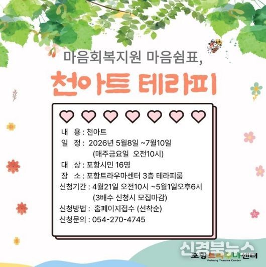 [신경북뉴스] 포항시 북구보건소 트라우마센터는 5월 8일부터 7월 10일까지 포항 시민을 대상으로 ‘마음쉼표, 천아트 테라피’ 프로그램을 주 1회 운영한다.