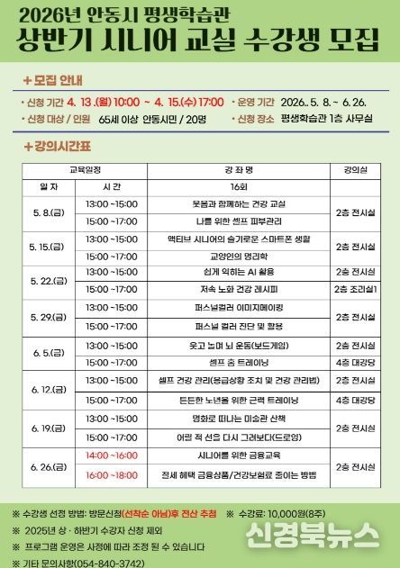 [신경북뉴스] 안동시 평생학습관은 지역 어르신들의 활기찬 노후 생활과 자기계발을 지원하기 위해 ‘2026년 상반기 시니어교실’ 수강생을 모집한다.