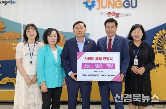 [신경북뉴스] 대구 중구는 사단법인 한국나눔연맹(대표 안지애)가 지난 22일 대구 중구청을 방문해 추석 명절을 맞아 백미(10kg) 1,000포, 라면(12개입) 1,000박스, 간식(쌀과자 50봉) 1,000박스 등 이웃돕기 성품을 기탁했다고 밝혔다.