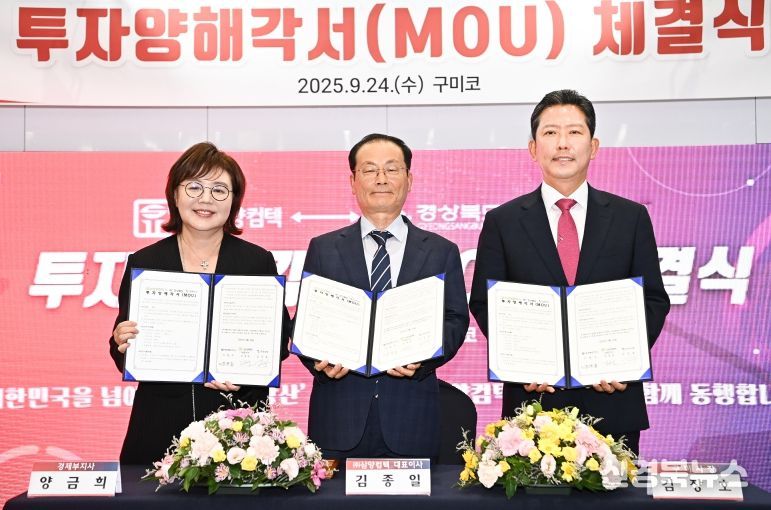 [신경북뉴스] 구미시는 9월 24일 구미코 경북라운지에서 2025 항공방위물류박람회(GADLEX) 개막 행사 전에 양금희 경상북도 경제부지사, 김장호 구미시장, 박교상 구미시의회 의장, 김종일 대표이사 등이 참석한 가운데 ㈜삼양컴텍와 경상북도·구미시 간 투자양해각서(MOU)를 체결했다.
