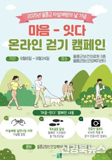 [신경북뉴스] 울릉군정신건강복지센터는 경상북도 및 경북광역정신건강복지센터와 함께 9월 8일부터 9월 24일까지 운영한 '마음-잇다' 생명사랑 온라인 걷기 캠페인을 성황리에 마무리했다.