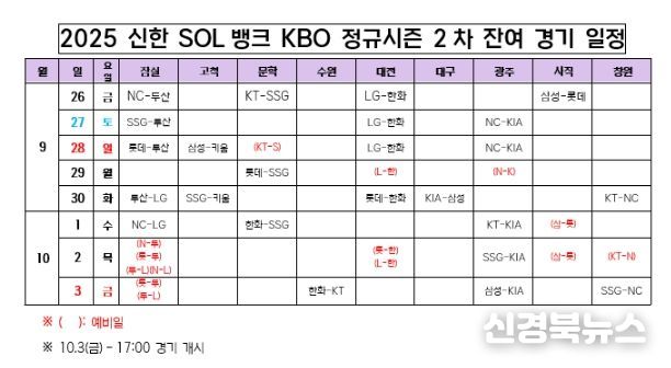 [신경북뉴스] KBO는 26일(금) 2025 신한 SOL뱅크 KBO 정규시즌 2차 잔여 경기 일정을 확정했다.