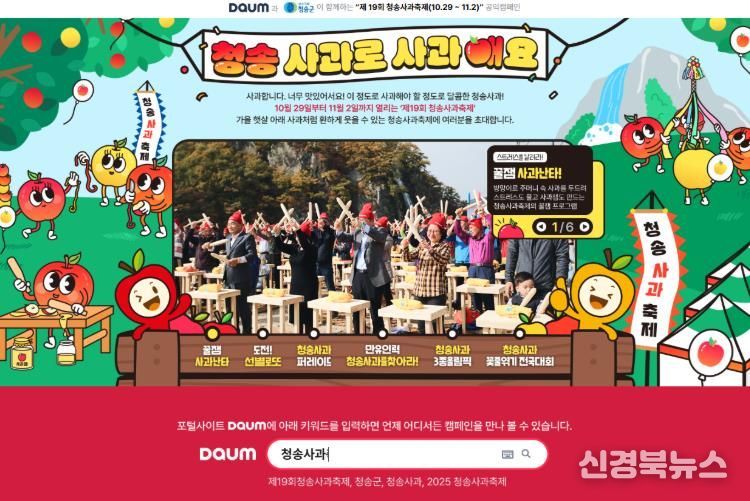 [신경북뉴스] 청송군은 29일부터 포털사이트 다음(daum)에서 11월 2일까지 '제19회 청송사과축제' 온라인 축제를 개최한다.