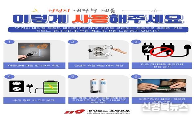 [신경북뉴스] 경산소방서는 최근 전동킥보드, 휴대폰, 청소기, 전동드릴 등 배터리(건전지) 내장형 제품에서 화재가 잇따라 발생함에 따라 시민들에게 각별한 주의를 요청했다.