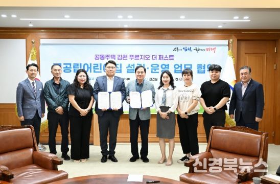 [신경북뉴스] 김천시는 9월 29일 2층 접견실에서 공동주택 김천 푸르지오 더 퍼스트 어린이집 입주자대표회의(회장 유민상)와 국공립어린이집 설치‧운영을 위한 업무협약을 체결했다.