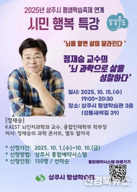 [신경북뉴스] 상주시 평생학습원은 2025. 10. 15. 오후 7시부터 8시30분까지 상주시 평생학습관 3층 강당에서 뇌과학자이자 미래학자인 정재승 KAIST 교수를 초청하여 특별 강연을 진행한다.