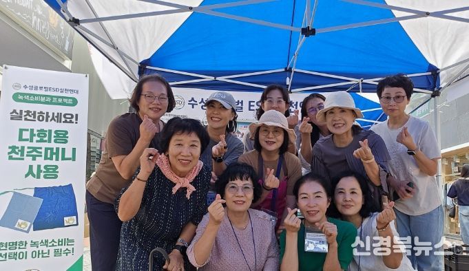 천주머니에는 수성구 캐릭터 ‘뚜비’ 라벨을 회원들이 직접 부착했으며, 시민들에게 배포하며 일회용 비닐봉투 사용을 줄이기 위한 홍보 활동을 전개했다.