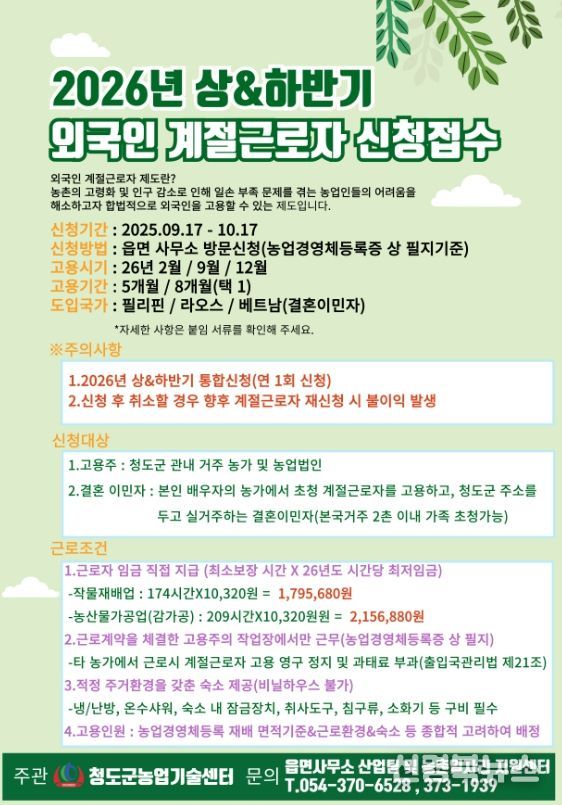 [신경북뉴스] 청도군은 농촌 인구감소와 고령화로 인한 농번기 일손 부족 문제 해소를 위해 9월 17일부터 10월 17일까지 '2026년 상·하반기 외국인 계절근로자' 고용 희망농가 수요조사를 실시하고 있다.