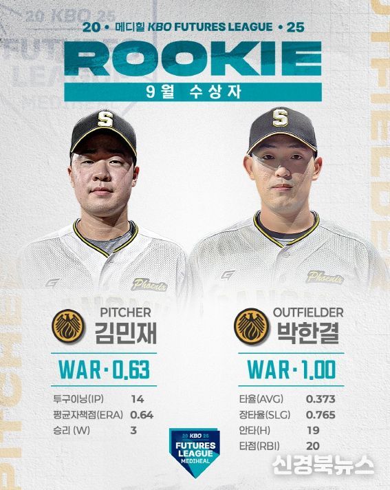 [신경북뉴스] 2025 메디힐 KBO 퓨처스리그의 9월 퓨처스 루키상 수상자로 투수 부문에는 상무 김민재가 WAR 0.63, 타자 부문에는 상무 박한결이 WAR 1.00을 기록하며 각각 선정됐다.