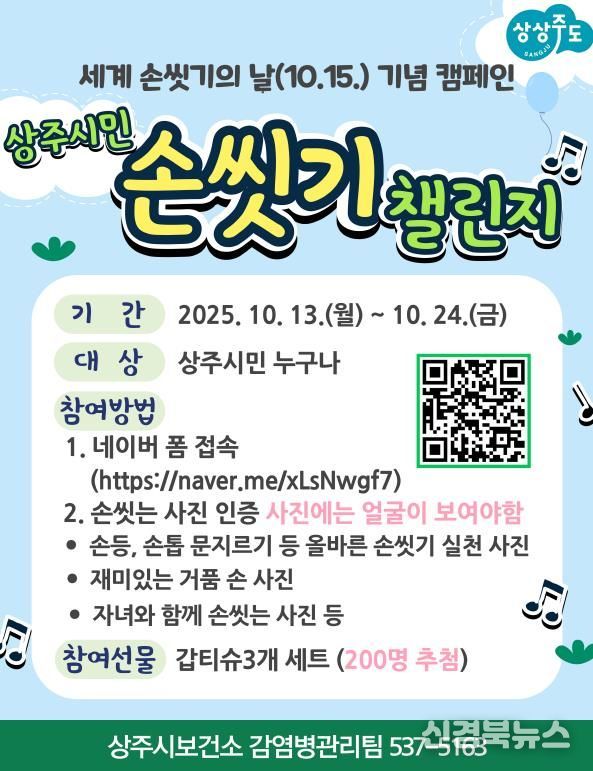 [신경북뉴스] 상주시는 ‘세계 손씻기의 날(10.15.)’을 기념하여 10월 13일부터 24일까지‘상주시민 손씻기 챌린지’를 실시한다.