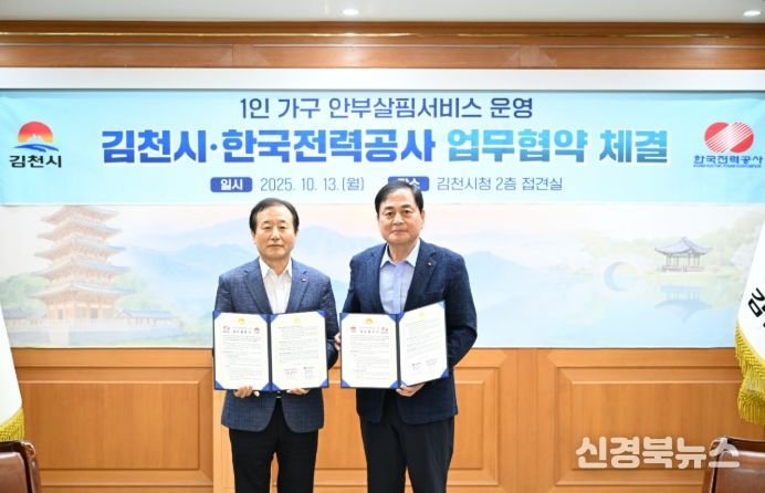[신경북뉴스] 김천시는 지난 13일 한국전력공사 대구본부 김천지사(지사장 박용성)와 함께 ‘1인 가구 안부살핌서비스 '든든e살핌'’ 업무협약을 체결했다.