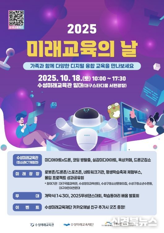 [신경북뉴스] 수성미래교육재단)이 주최하고 수성미래교육관이 주관하는 ‘2025 미래교육의 날’ 행사가 오는 18일 수성미래교육관 일대 대구스타디움 서편광장에서 개최된다.