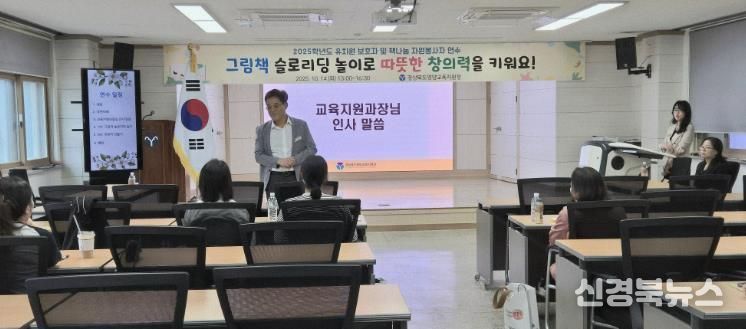 [신경북뉴스] 경상북도영양교육지원청은 2025년 10월 14일 영양교육지원청 대회의실에서 ‘그림책 슬로리딩 놀이로 따뜻한 창의력을 키워요’라는 주제로 관내 유치원, 어린이집 및 초등 1, 2학년 학생과 학부모를 대상으로 2025 유치원·초등 저학년 보호자 및 책나눔 자원봉사자 연수를 개최했다.