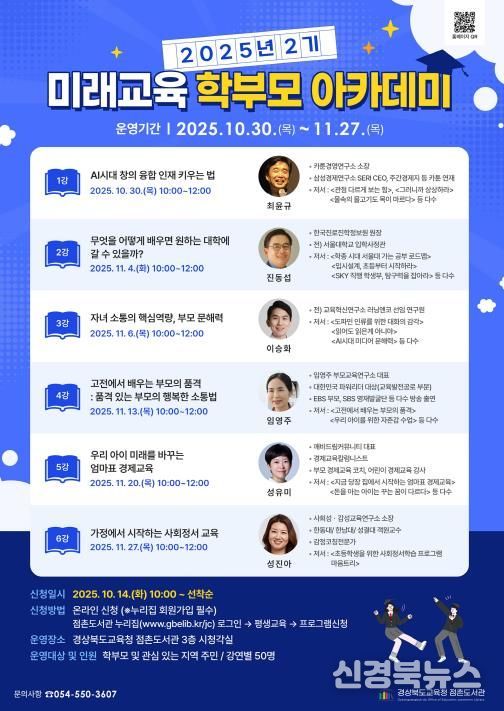 [신경북뉴스] 경상북도교육청 점촌도서관은 10월 30일부터 11월 27일까지 학부모 및 일반인을 대상으로 2025년 2기'미래교육 학부모 아카데미'를 운영한다.