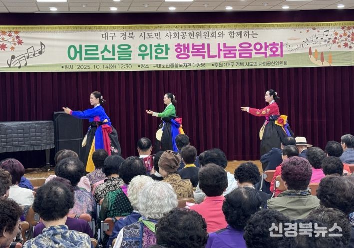 [신경북뉴스] 구미시는 지난 14일 노인종합복지관 3층 대강당에서 구미노인대학 입학 어르신 220여 명을 모시고 행복나눔음악회를 개최했다.