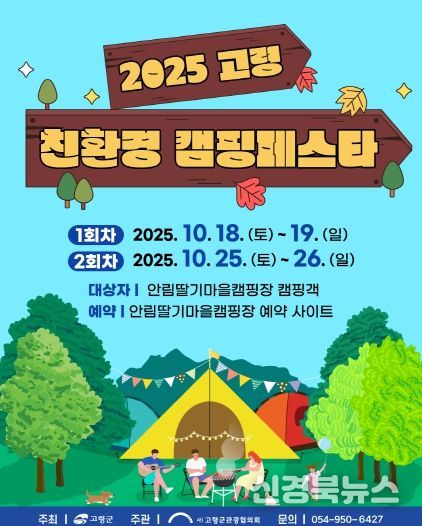 [신경북뉴스] 지역과 미래를 배려하는 친환경 캠핑 문화 확산을 위해 마련된 ‘2025 고령 캠핑 페스타’가 오는 10월 18일부터 19일, 10월 25일부터 26일 두 차례에 걸쳐 안림딸기마을캠핑장에서 열린다.