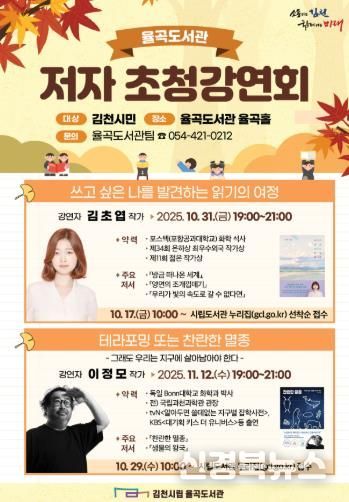이신기 김천시립도서관장은 “이번 저자 초청 강연회을 통해 시민들이 독서의 즐거움뿐만 아니라 생각의 폭을 넓히는 시간을 보내길 바란다. 율곡도서관은 앞으로도 함께 배우고 성장하는 지식의 공간이 되겠다.”라고 전했다.