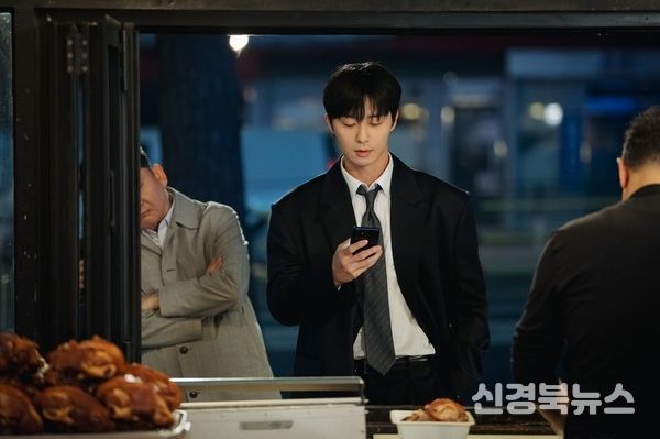 공개된 사진 속에는 일과를 마친 직장인 이경도의 퇴근 현장이 담겨 있다. 살짝 풀린 넥타이가 이경도 캐릭터의 어른미(美)를 더욱 돋보이게 만든다. 퇴근 후에도 휴대폰을 손에서 놓지 않고 계속해서 이슈를 확인하는 이경도의 눈빛에는 일상의 권태로움이 서려 있다.