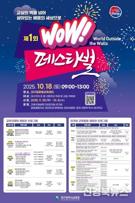 [신경북뉴스] 대구시교육청은 10월 18일 9시부터 대구글로벌교육센터에서 '교실의 벽을 넘어 살아있는 배움의 세상으로'를 주제로‘제1회 WOW(World Outside the Walls) 페스티벌’을 개최한다.