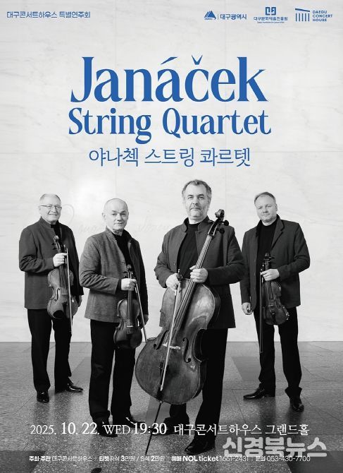 [신경북뉴스] (재)대구문화예술진흥원 대구콘서트하우스는 2025년 한-체코 수교 35주년을 맞아, 체코 정통 실내악의 깊이를 전하는 세계적인 현악4중주단 ‘야나첵 스트링 콰르텟(Janáček String Quartet)’의 내한공연을 오는 10월 22일 오후 7시 30분, 대구콘서트하우스 그랜드홀에서 개최한다.