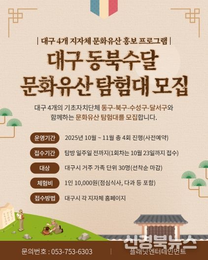 [신경북뉴스] 대구 북구청은 지난 2월 대구 4개 기초자치단체(북구, 달서구, 동구, 수성구)가 체결한 ‘대구 문화유산 공동연구 및 활용·보호’업무 협약의 일환으로 「대구 문화유산 탐험대」를 운영한다.