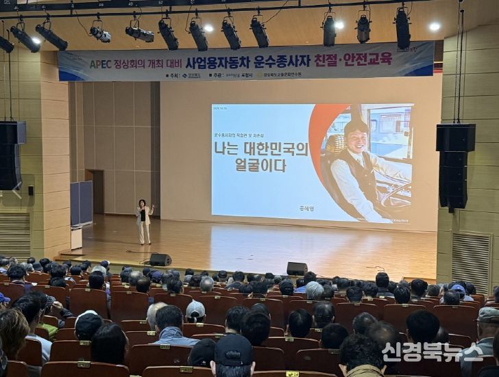 [신경북뉴스] 포항시는 20일부터 오는 23일까지 나흘간 덕업근로자종합복지관에서 버스·택시·화물 등 사업용자동차 운수종사자 1,200명(하루 300명씩)을 대상으로 ‘APEC 정상회의 개최 대비 친절·안전 교육’을 진행하고 있다.