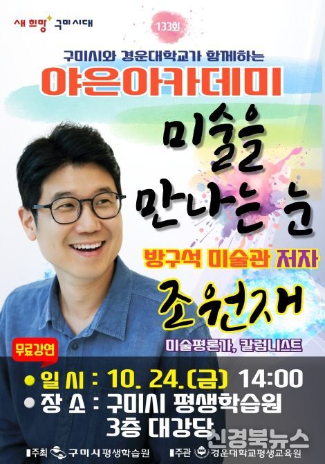 [신경북뉴스] 구미시는 10월 24일 오후 2시 구미시평생학습원 대강당에서 미술평론가 조원재를 초청해 ‘미술을 만나는 눈’을 주제로 '제133회 야은아카데미' 특별강연을 연다.