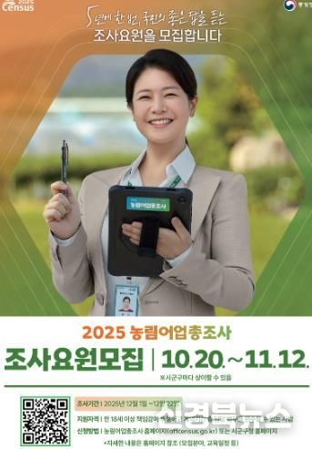 [신경북뉴스] 김천시는 오는 12월 1일부터(온라인 조사는 11월 20일부터) 실시되는 2025 농림어업총조사의 성공적 추진을 위해 조사원과 관리자 등 조사 인력을 모집한다.